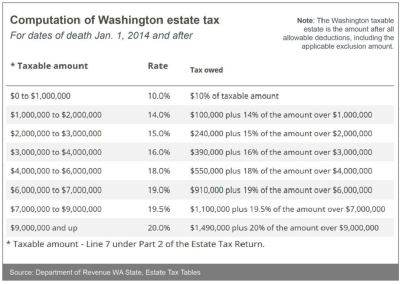 If the death occurred in 2022, the applicable exclusion amount is $2,193,000. Once the exclusion amount is reached and all allowable deductions are taken, WA estate taxes compute using the following table:
